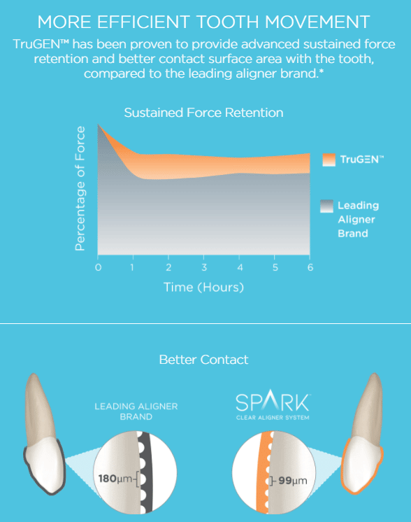 Spark aligners uses the latest in clear aligner technologic material called TruGEN™. TruGEN™ is scientifically proven to provide more effective tooth movement compared to other aligners. This is achieved due to advances in sustained force duration/application and improved surface area contact with teeth.